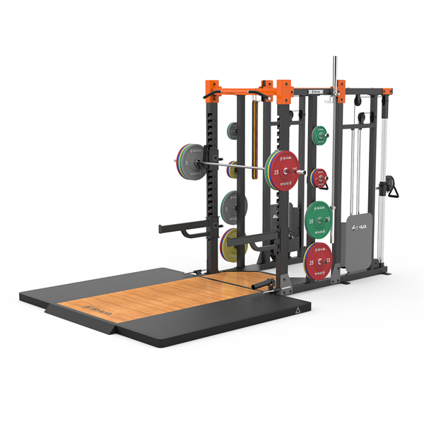 舒華高端綜合框式力量訓(xùn)練器SH-G8903功能區(qū):杠鈴片整組掛架、萬向炮筒、舉重桿保護(hù)架、單杠架、雙杠架、大飛鳥功能。