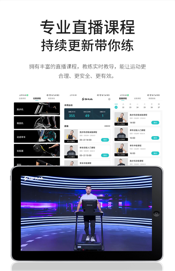 舒華X5 Pro豪華智能跑步機采用全新舒華跑步機系統(tǒng),搭載21.5寸大屏,內(nèi)置九種運動程序,包括場景跑、在線約跑和一鍵體育考試等內(nèi)容,亦有教練在線科學指導和比賽互動,可在線升級,歷經(jīng)耐久性測試,讓您使用更安全,雙跑臺設計,全減震系統(tǒng),核心動力采用F級耐高溫馬達,5.0HP峰值馬力,提供源源動力,讓您享受每一次暢跑體驗。