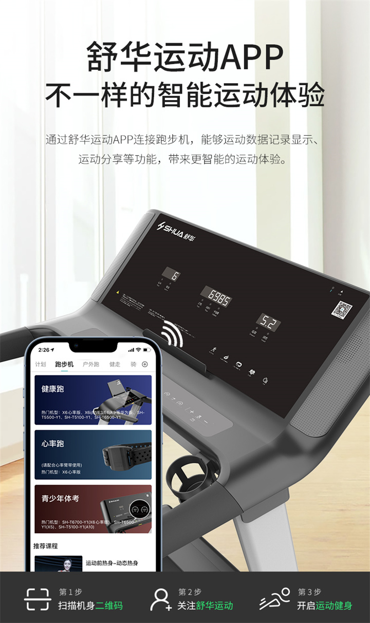 舒華I5智能家用跑步機是由舒華體育聯(lián)合中國體育科學學會、上海體育大學運動科學學院教授陸大江等權威機構、專家共同研發(fā)設計。獨特之處在于它結合國際科學跑步研究理論,能夠針對不同用戶進行運動能力測試,并根據(jù)測試結果生成因人而異的有氧運動處方。這意味著每個用戶都能得到一個適合自己的運動方案,從而更好地達到運動效果。這一創(chuàng)新技術可以確保用戶在運動過程中能夠保持在最佳的區(qū)間狀態(tài),從而提高運動安全性和有效性。