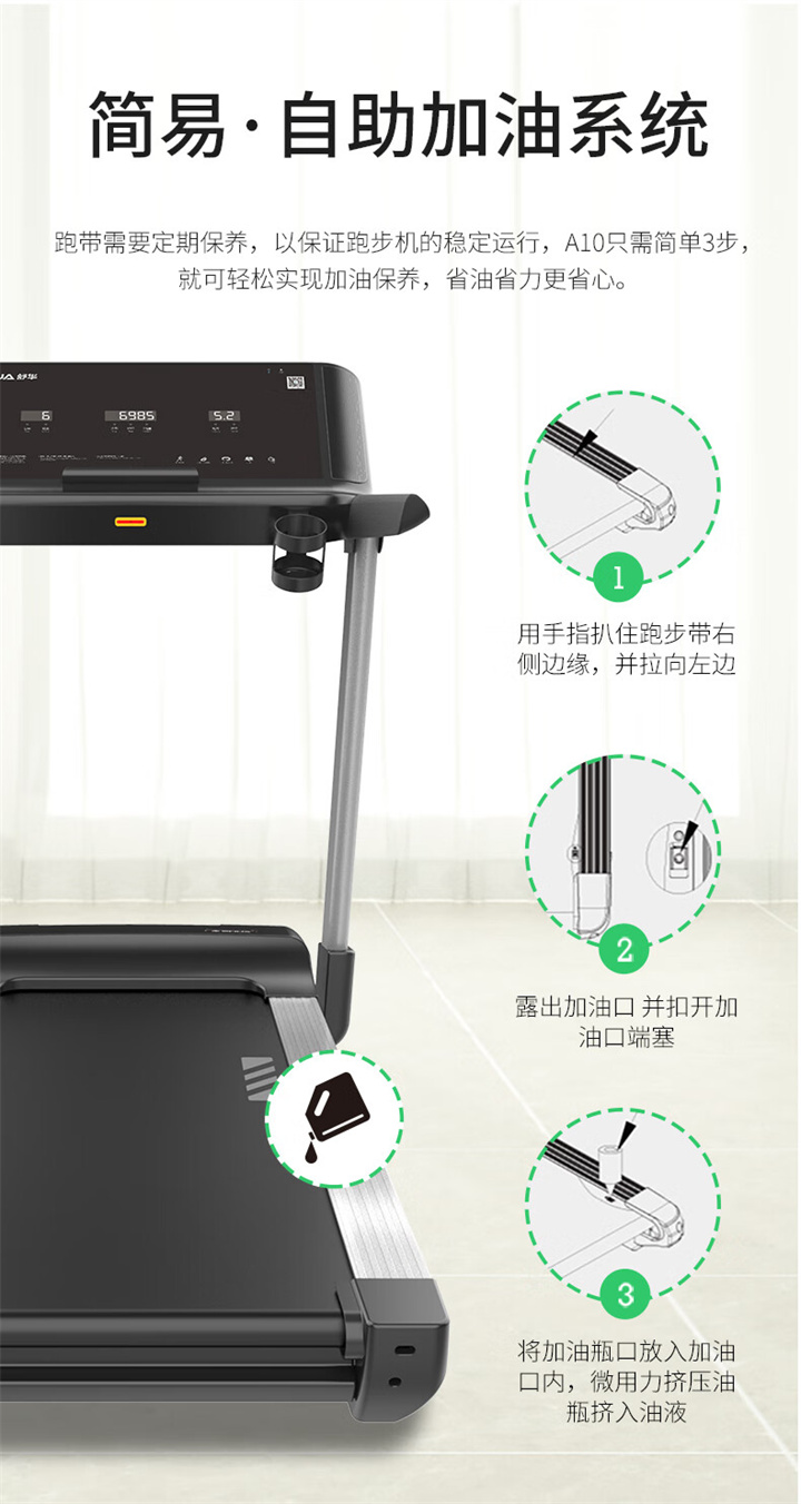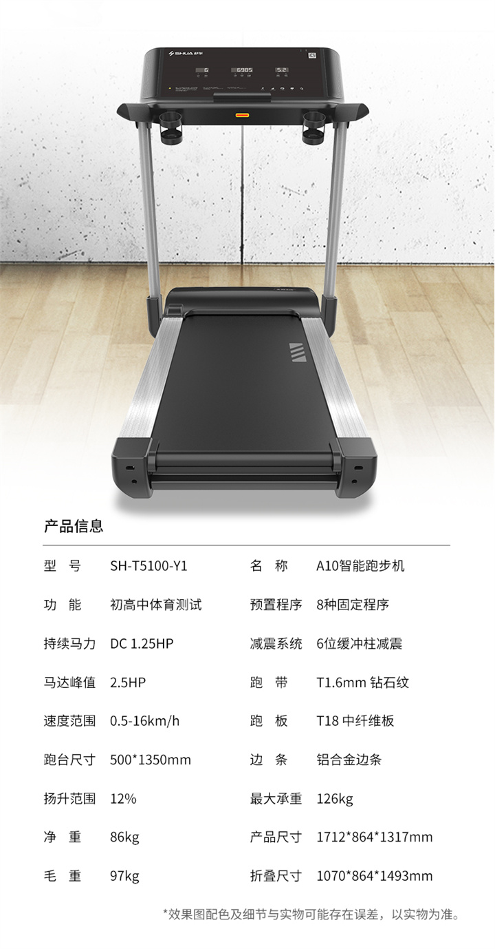 舒華家用跑步機SH-T5100持續(xù)馬力達1.25HP,具有500×1350mm的跑臺,運用無線心率接收模塊監(jiān)測心率,運用6位硅膠減震設計,最大承重是126kg,可以滿足大多數(shù)家庭的使用。