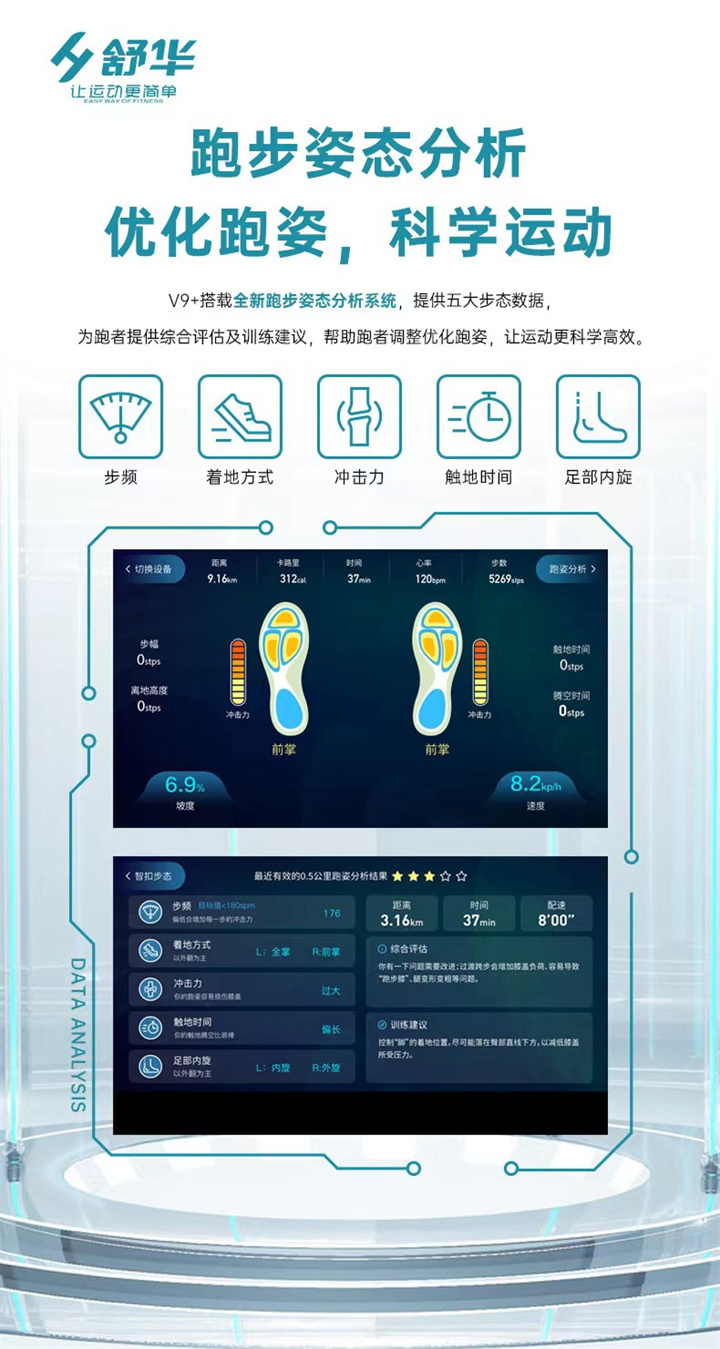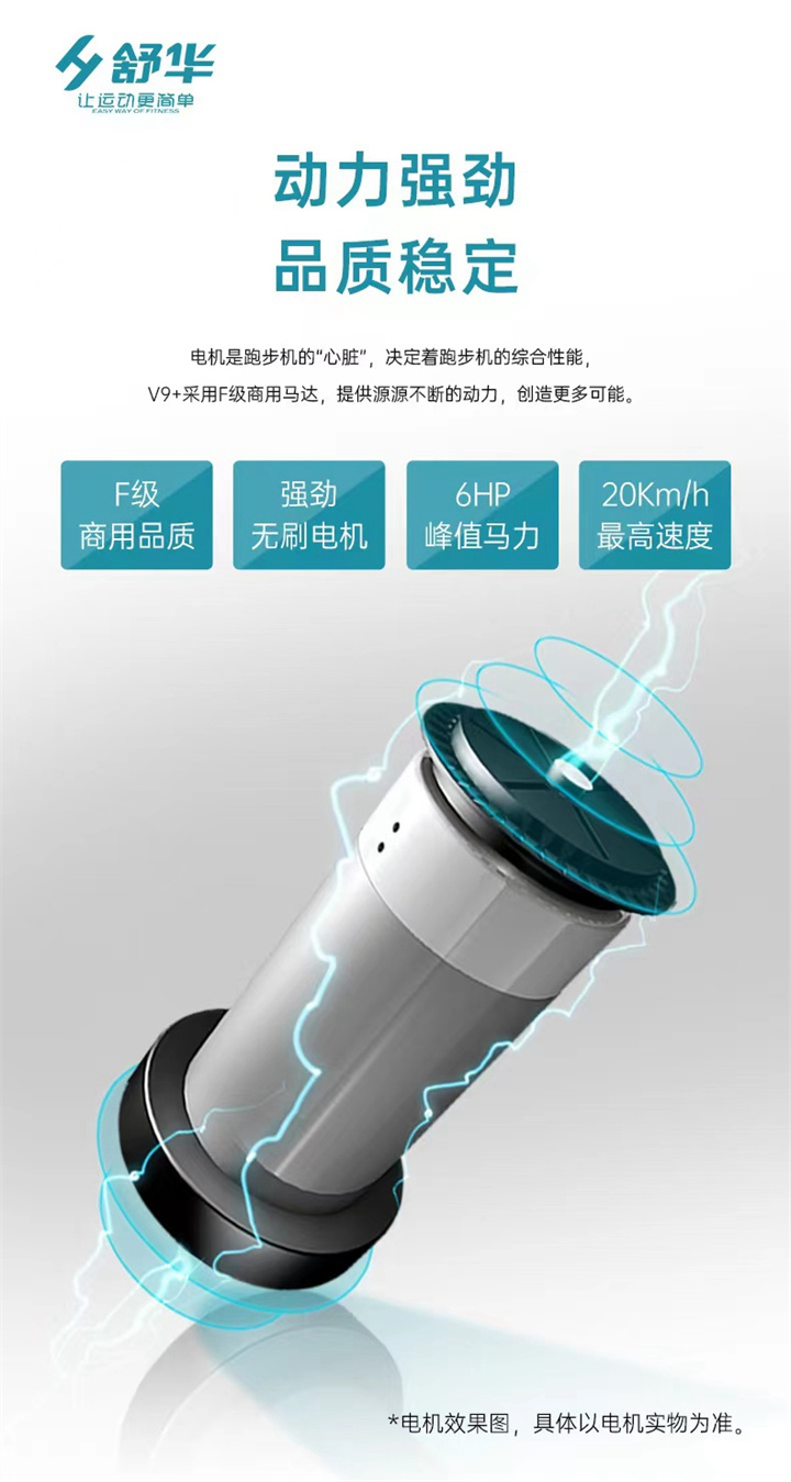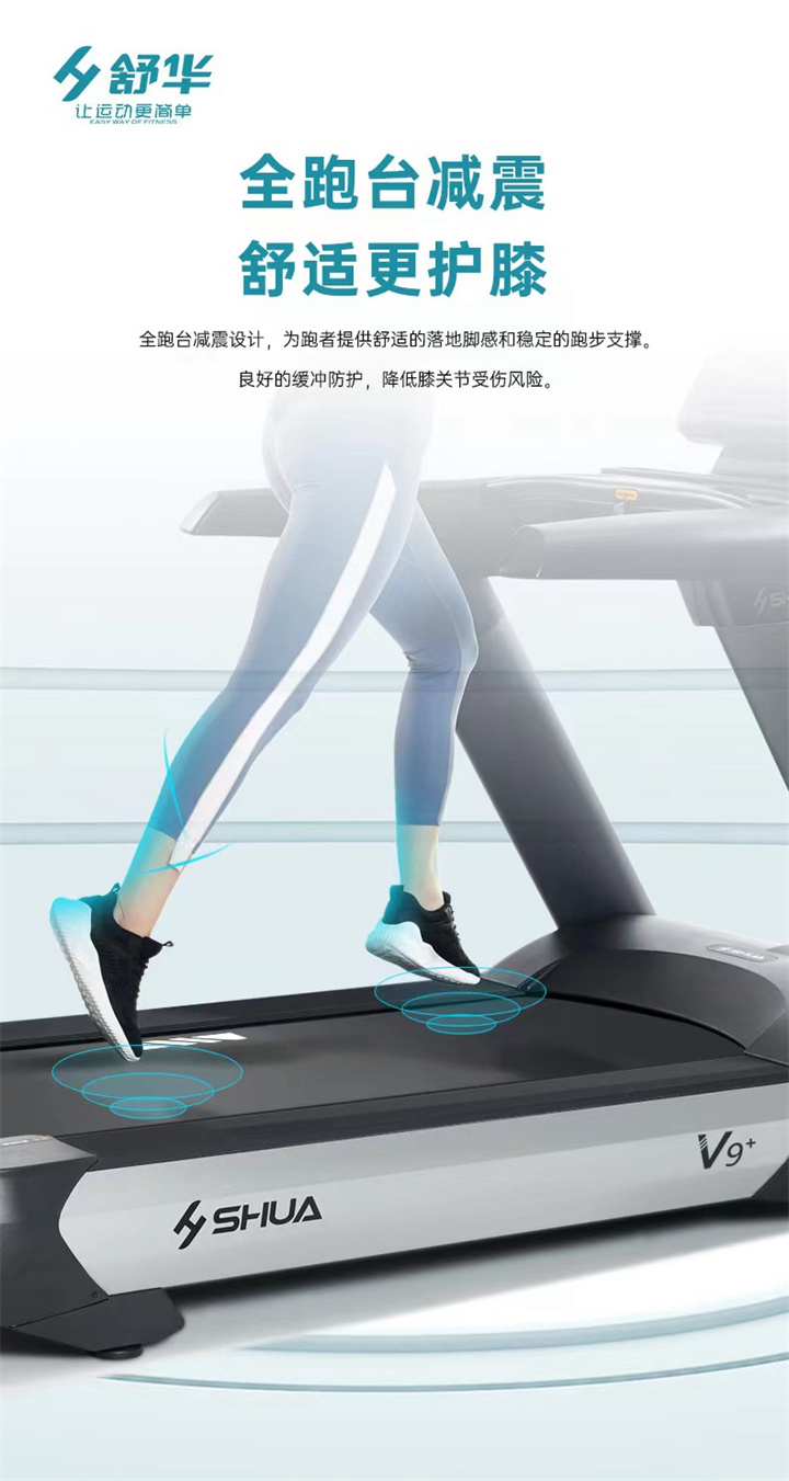 智能商用跑步機SH-T8919T-Y50(V9+)全跑臺減震設計,跑臺尺寸達580×1570mm,馬達采用3.0CP,配備21.5寸大屏,速度范圍0.8—20km/h,坡度也可以-3—15%,可承受180kg的使用者使用。