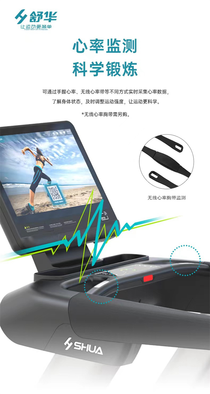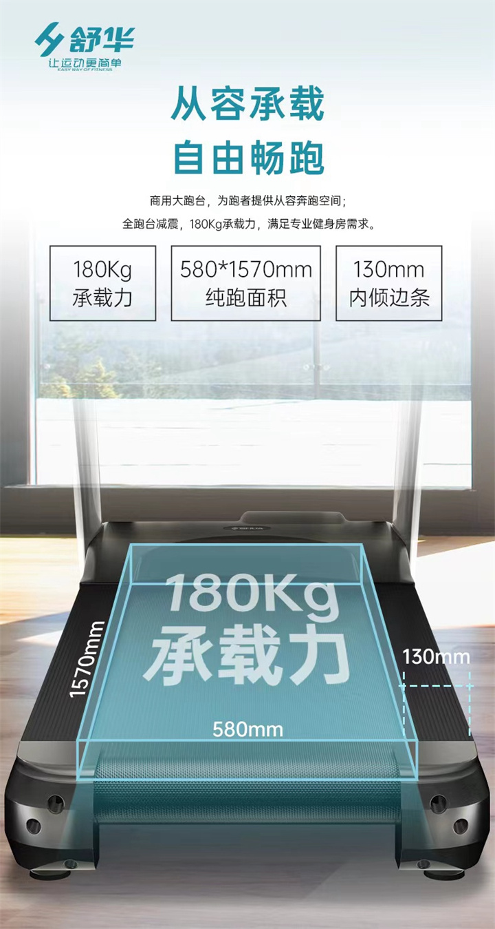舒華商用跑步機SH-T8919采用t2.2mm黑鉆紋(可選配:t2.4免維護跑帶)的跑帶,,選用手握心率測試 自帶心率帶及增加心率控速(HRC)程序模塊、接觸式心率感應測量心跳等數(shù)據(jù),跑步面積達580×1570mm,可承受180kg的使用者使用。